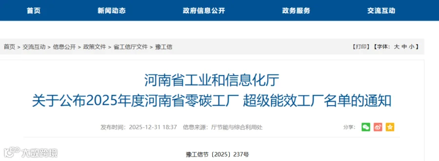 关于公布2025年度河南省零碳工厂 超级能效工厂名单的通知