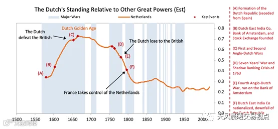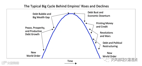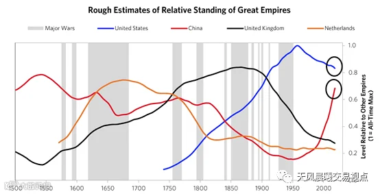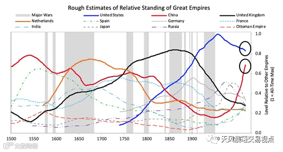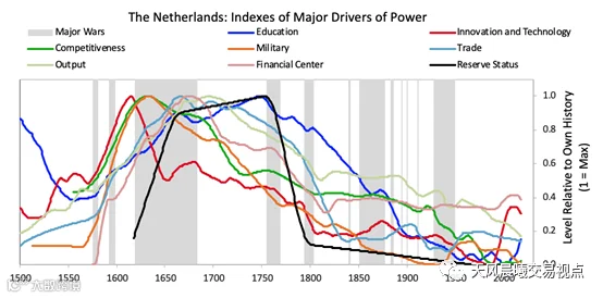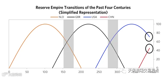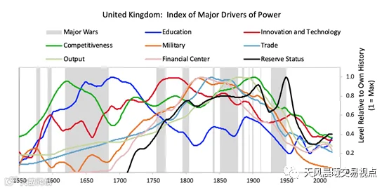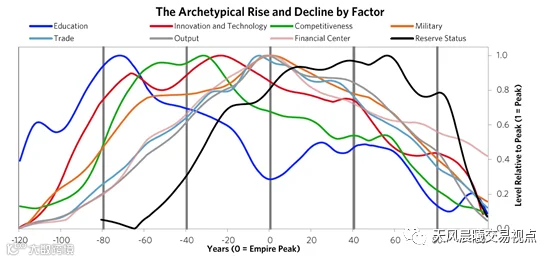 [1] 我们通过对不同情况下的关键指标进行平均,来显示这些指标与它们的历史相关的地方。图中显示的值1表示该指标相对于历史的峰值,0表示低谷。时间轴以年为单位显示,0大致代表了这个国家在其鼎盛时期的时间(当时各指标的平均值处于峰值)。在本节的其余部分中,我们将更详细地介绍经典模型的每个阶段。虽然图表显示了产生全球储备货币的国家,但我们也将大量参考中国,尽管它从未建立储备货币,但它是几个世纪以来的主要帝国。