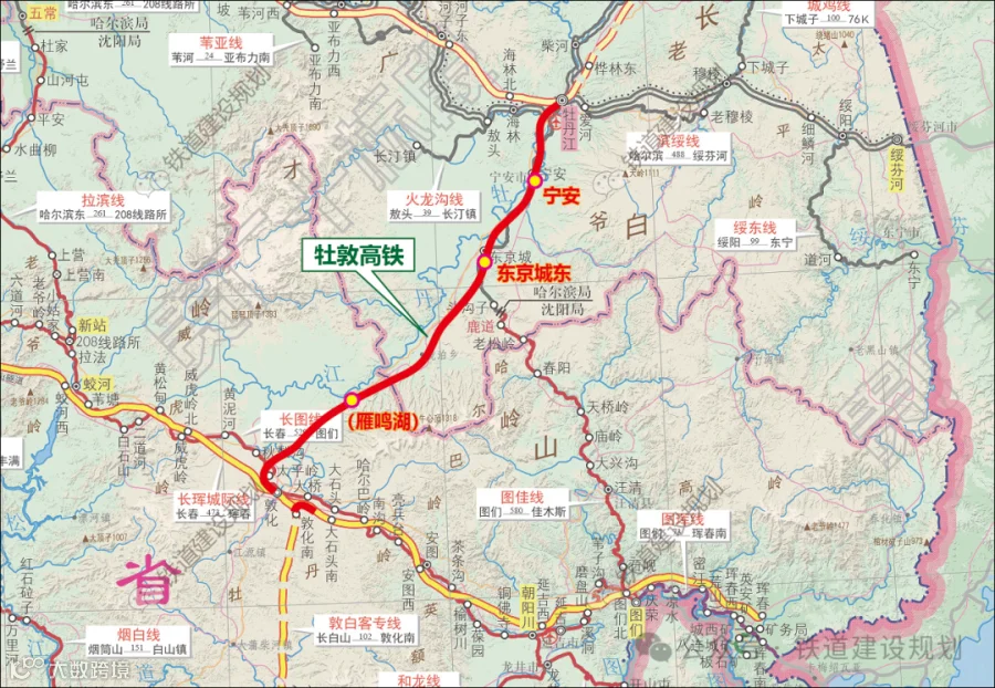 “全线设车站5座,其中新建雁鸣湖、东京城东2座车站,改建敦化、宁安2座车站,利用既有牡丹江1座车站;雁鸣湖为越行站,预留客运条件。相关工程:敦化地区新建长白山至延吉方向联络线;东京城地区普速外迁工程;牡丹江动车所增建8条存车线。”