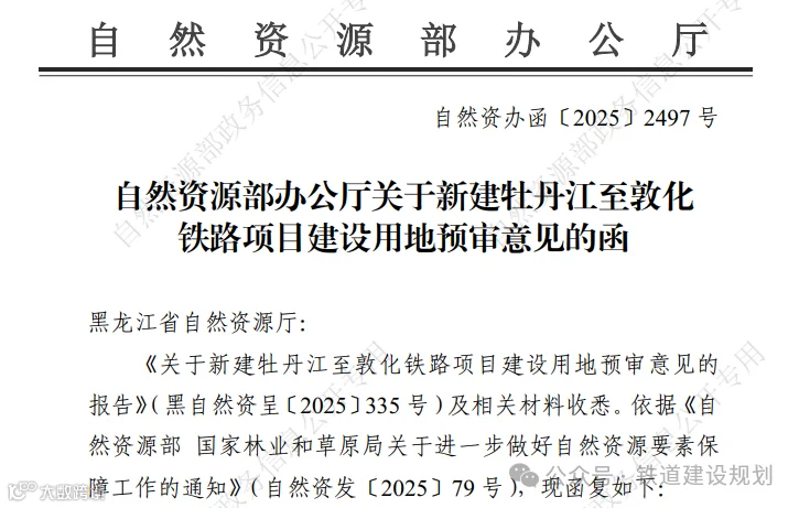 10月30日,自然资源部办公厅印发《关于新建牡丹江至敦化铁路项目建设用地预审意见的函》,牡敦高铁黑龙江段用地预审正式获国家批复,为项目可研批复奠定了基础。根据意见函: