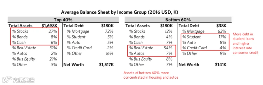 美国前40%富有的人跟剩下的60%的人资产配比情况;可以明显看到富人的金融资产占比高达35%[8]