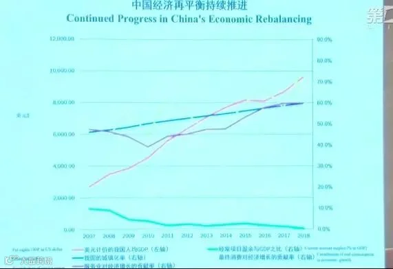 我特地给大家做了一张图,来说明中国经济再平衡是持续推进的过程。这条线(应是红线)是人均GDP水平,黄线是消费对经济增长的贡献率,蓝线是城市化率,紫线是服务业对经济增长的贡献率,底下的这条绿线是经常项目顺差占GDP的比重。