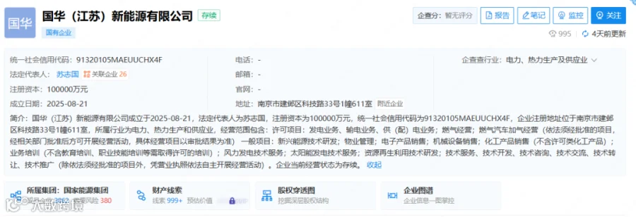 8月21日,国华(江苏)新能源有限公司正式注册落户南京市建邺区生态科技岛 ,注册资本10亿元人民币。