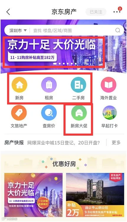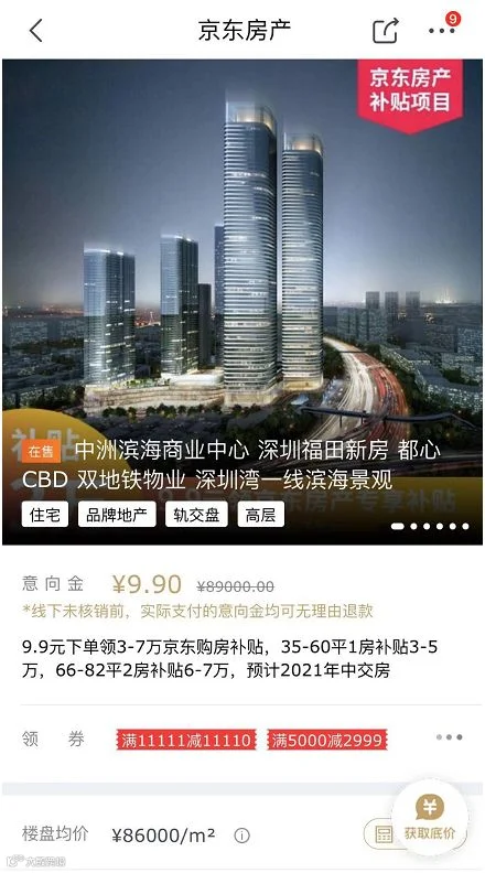 小编打开深圳福田一新房,显示为“京东房产补贴项目”,只需9.9元下单即可领取3-7万京东购房补贴。此外,还有满11111减11110等优惠券。