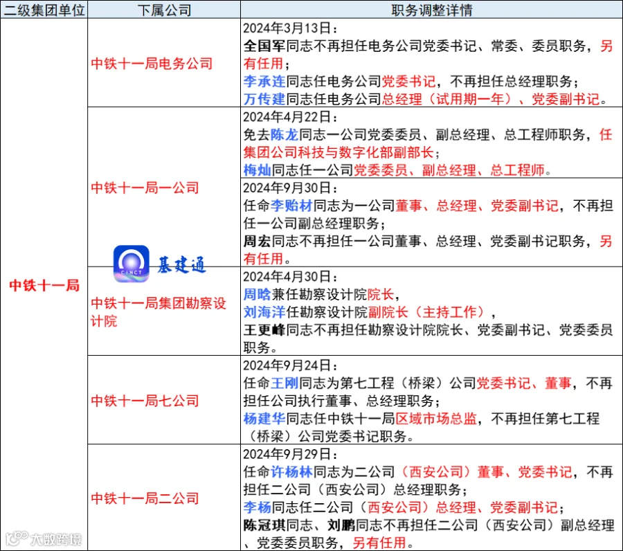 任命周晗为中铁十一局党委副书记、董事,为总经理人选。