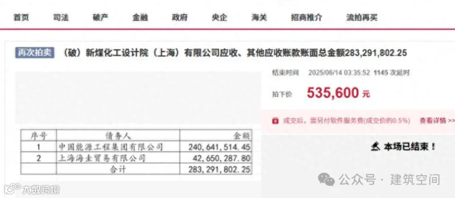 具体是拍卖新煤化工设计院(上海)有限公司应收款,应收款只有两笔,也就是只有两家公司欠款,但是账目金额巨大,约2.8329亿元。