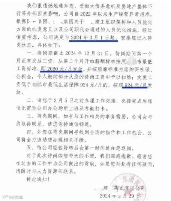 此前,某市建工建团发了一个人员优化的通知:受恒大债务危机,公司自2022年以来生产异常困难,决定自2024年3月1日起,安排进入待岗状态。3月5日前办理工作交接,后续无需再上班。