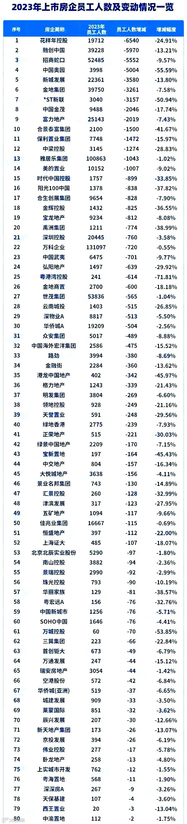 2023年,101家上市房企的总员工人数为82.92万,同比2022年减少了4.78万。平均下来,统计范围内的房企在去年平均减少了473人。当中,有80家房企在2023年均出现了不同程度的减员,减员人数6.09万。