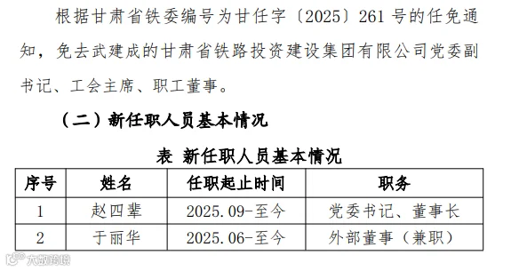 根据甘肃省政府国资委编号为甘政任字〔2025〕6 号的 任免通知,于丽华为甘肃省铁路投资建设集团有限公司外 部董事职务(兼职)。