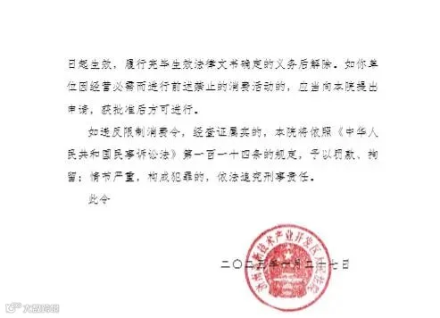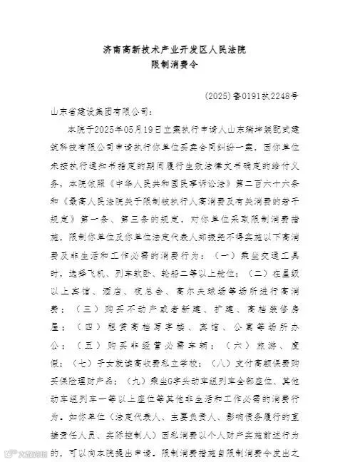 限制消费令显示,济南高新技术产业开发区人民法院于2025年5月19日立案执行申请人山东瑞坤装配式建筑科技有限公司申请执行该单位买卖合同纠纷一案,因该单位未按执行通知书指定的期间履行生效法律文书确定的给付义务,法院依照《中华人民共和国民事诉讼法》第二百六十六条和《最高人民法院关于限制被执行人高消费及有关消费的若干规定》第一条、第三条的规定,对该单位采取限制消费措施,限制该单位及该单位法定代表人郑振尧不得实施购买不动产、子女就读高收费私立学校和旅游度假等高消费及非生活和工作必需的消费行为。发布时间为2025年10月27日。
