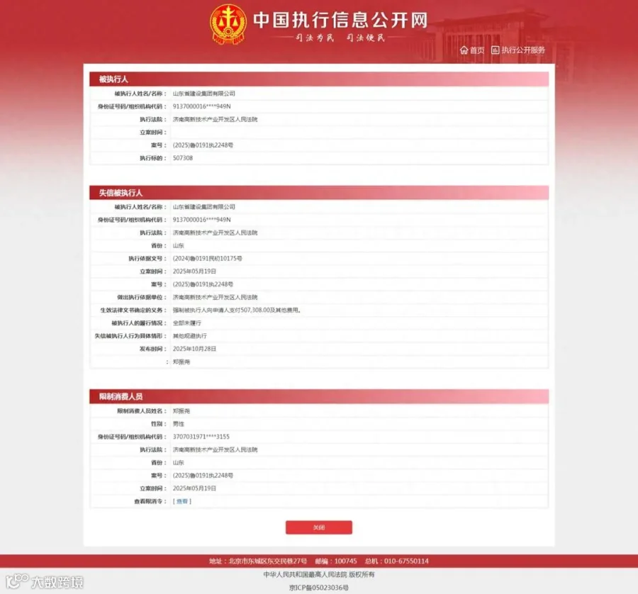 近日,中国执行信息公开网披露了山东省建设集团有限公司(下称“山东省建设集团”)的失信被执行人信息。同时,该公司及其法定代表人郑振尧收济南高新技术产业开发区人民法院限制消费令。