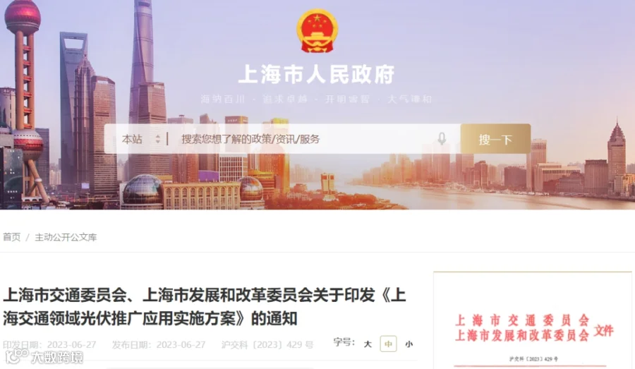 2023年6月27日,上海市交通委员会、上海市发改委联合印发《上海交通领域光伏推广应用实施方案》,这也是全国首个“光伏+交通”政策出台。