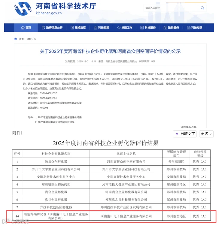 近日,河南省科技厅发布了《关于公布2025年度河南省科技企业孵化器和河南省众创空间评价情况的公示》。经年度统计数据、专家评定等综合评定,在此次评价,港投·智能终端孵化器获评优秀(A类)。