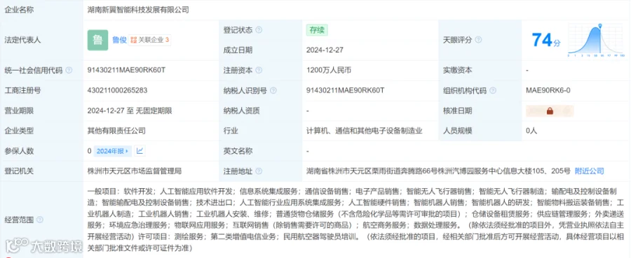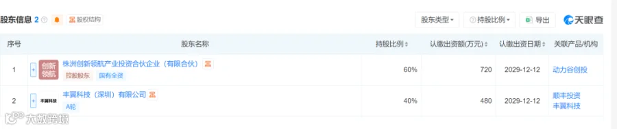 据天眼查工商信息显示,湖南新翼智能科技发展有限公司注册成立于2024年12月,国有企业株洲创新领航产业投资合伙企业(有限合伙)持股60%, 顺丰旗下的丰翼科技(深圳)有限公司持股40%。