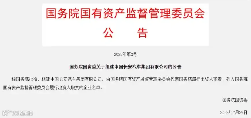 2025年7月,两家新央企相继成立:7月19日中国雅江集团有限公司组建,7月29日中国长安汽车集团有限公司组建,分别列入《央企名录》第22号和第73号。至此,国务院国有资产监督管理委员会《央企名录》总数达到100家整!