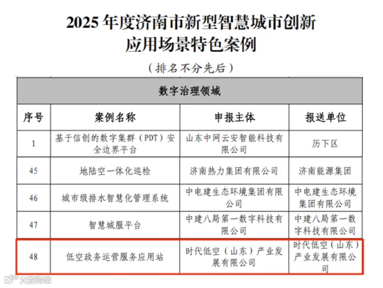 近日,济南市大数据局正式公布“2025年度济南市新型智慧城市创新应用场景特色案例”入选名单。时代低空(山东)产业发展有限公司报送的“低空政务服务运营应用站”经评审成功入选数字治理领域创新应用场景特色案例。