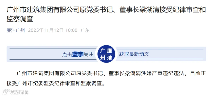 据“廉洁广州”11月12日消息,广州市建筑集团有限公司原党委书记、董事长梁湖清涉嫌严重违纪违法,目前正接受广州市纪委监委纪律审查和监察调查。