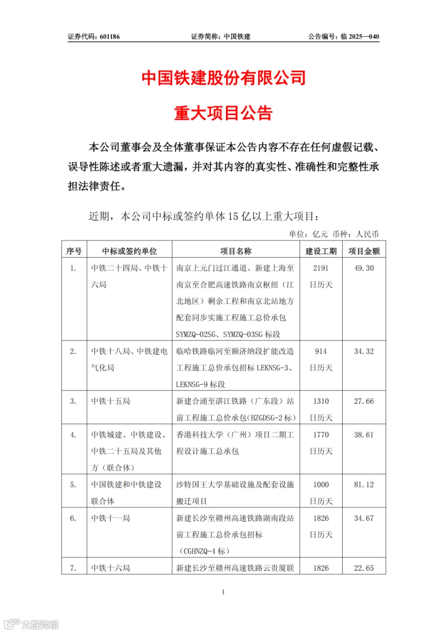 9月30日,中国铁建股份有限公司发布中标重大项目公告。近期,本公司中标或签约单体15亿以上重大项目: