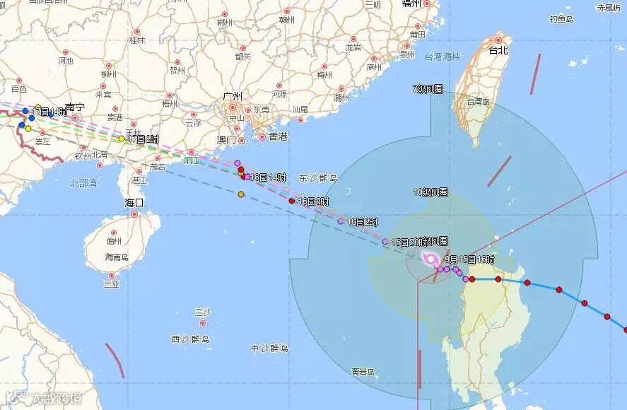 图为9月15日下午16时,台风“山竹”的位置。距离广东省阳江市东偏南方向约850公里的南海东北部海面上。