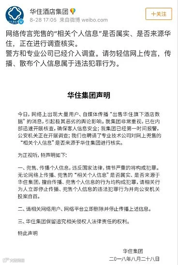 28日下午,华住集团就疑似信息泄露事件发布官方声明称,已经收到了网上所有信息,并已经报警,并聘请专业技术公司对网上兜售的“相关个人信息是否属实”进行核实,有进展将随时公之于众: