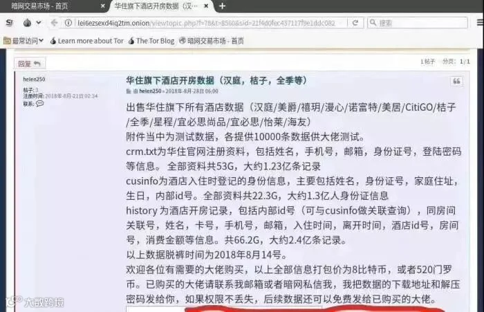 截图显示,8月21日,一名ID为“helen250”的黑客在“暗网”(一种不能通过搜索引擎访问到的网络,可简单理解为“地下网络”,有许多灰黑色交易)发帖贩卖华住集团数据。该黑客声称8月14日已经获取华住集团旗下所有酒店的住客数据。