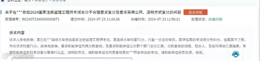 诉求人来电反映:其已在***连续三年参加国家注册监理工程师考试,其连续三年均是71分,只差一分过合格线,其评估其的考试得分为90分,但是其不了解,为何次次均是71分,故来电反映,要求职能单位为其分数复核,及要求职能单位公示那个部门总分汇算,分数复核的流程、经办人、及如何得出汇整结果,希望职能单位针对考试复分要进行公正、透明的方式,请职能单位也为其复核其在***历年参加的考试,请职能单位核实处理,谢谢。