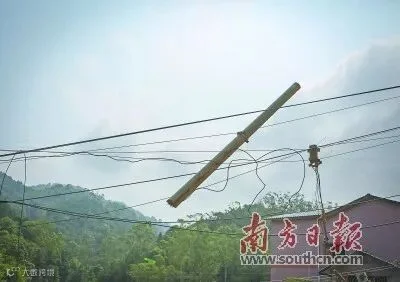 信宜市新宝镇道路上,一条电线杆被电线拉扯到半空。