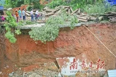 信宜市思贺镇的一段道路突然塌陷,形成一个深坑。