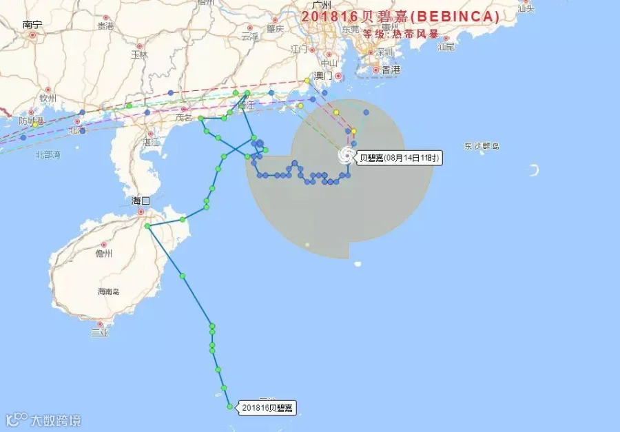 广东省气象台预计“贝碧嘉”14日将继续在广东省西部海面徘徊摆动,强度还将略有增强,并可能于14日夜间前后以热带风暴或强热带风暴级(10级左右)在西部沿海地区再次登陆,登陆后沿粤西沿海向广西方向移动,较长时间给粤西和珠江三角洲市县带来明显风雨影响。