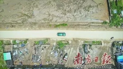 信宜市新宝镇大坝村道路两旁,一边是村民从家中清理出的杂物,一边是被大面积冲毁的农田。