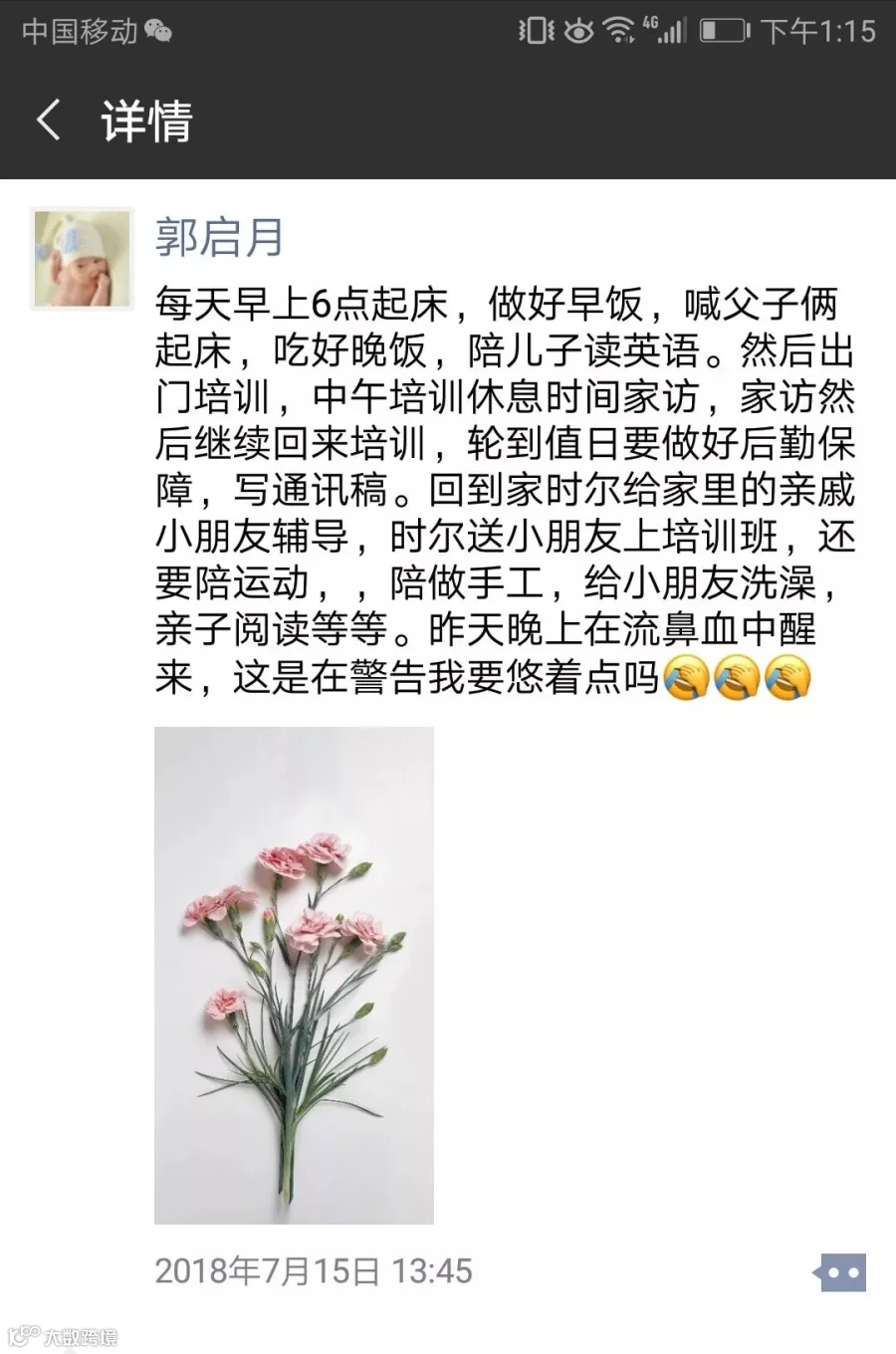 七月中旬,郭老师出现了并发症,并未察觉,依然投身工作当中,一边参加教师培训,一边家访。当时她发了这样一则朋友圈,至今让同事们痛惜不已。