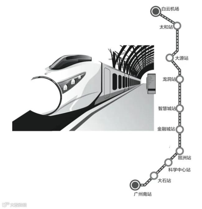 广佛环线广州南站至白云机场段线路全长46.707公里,全线设车站8座,分别为大石站、科学中心站、琶洲站、金融城站、智慧城站、龙洞站、大源站和太和站,其中太和站为高架站,其余均为地下站。