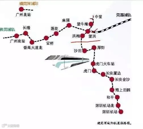 穗莞深城际线是珠三角城轨的主干线,起点是广州北站,在广州境内有白云机场、增城开发区、新塘等共15个车站,东莞境内有10个车站,最后进入深圳市区,设深圳机场北、深圳机场等4个车站。