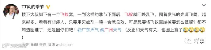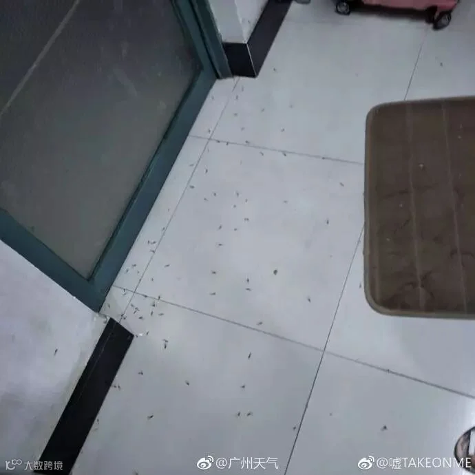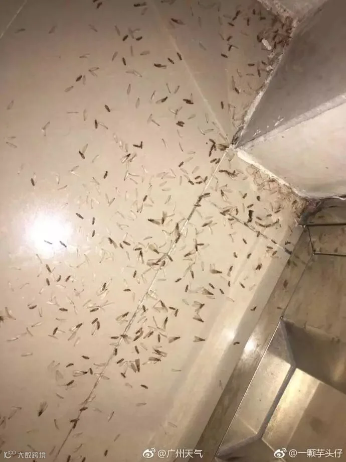 据@广东天气,大水蚁是白蚁中的大翅王族,这几天广东的强降水把它们给轰炸出来了,大水蚁习惯在闷热或大雨前后的傍晚飞出巢,经短期飞翔、脱翅、配对,然后寻找适合的地方筑新巢。白蚁破坏力极强,俗话说:“千里之堤,溃于蚁穴。“