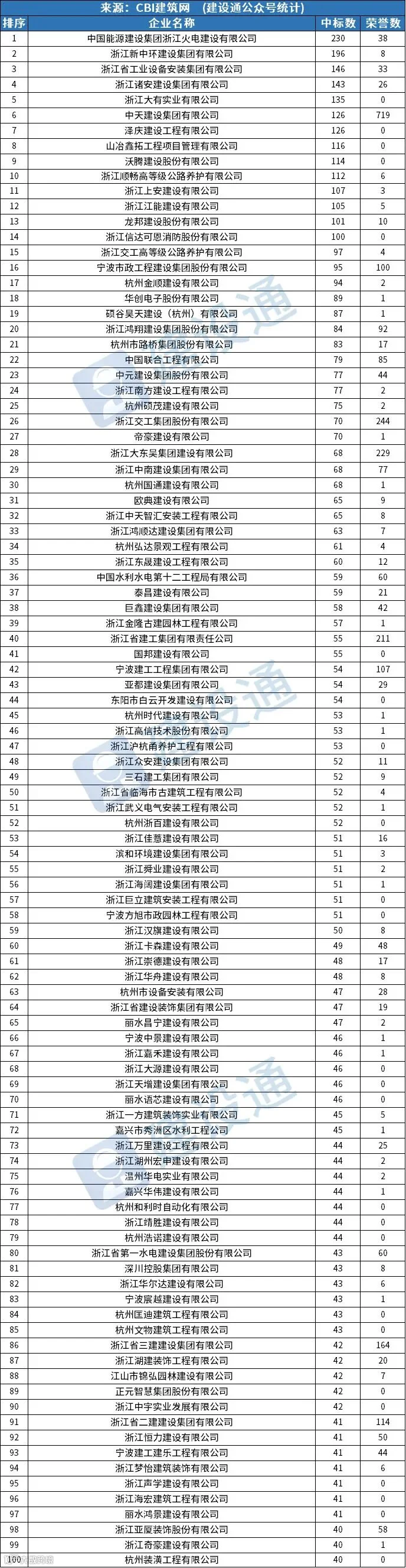 CBI建筑网综合报道在2024年,浙江省建筑施工企业中标数量达96559,同比(与去年同期)下降26.62%。其中,中国能源建设集团浙江火电建设有限公司、浙江新中环建设集团有限公司、浙江省工业设备安装集团有限公司分列浙江省建筑施工企业中标数量排行榜前三位。