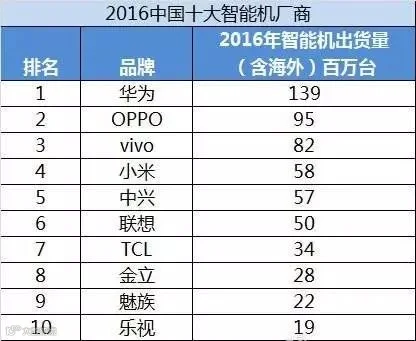 华为、OPPO、vivo占据前三。
