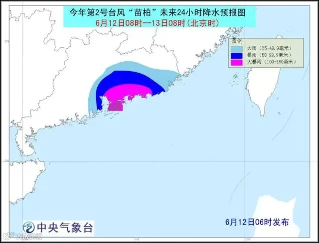 降水预报:12日08时至13日08时,广东中东部有大到暴雨,其中广东东南部局地有大暴雨(100~180毫米)。