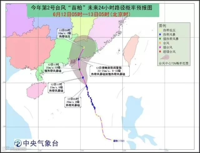 预计,“苗柏”将以每小时20公里左右的速度继续向北偏西方向移动,强度还将有所加强,预计最大强度为热带风暴级或强热带风暴级(9-10级,23-25米/秒),并将于12日傍晚到夜间在珠海到汕头一带沿海登陆,登陆时强度仍将为热带风暴级或强热带风暴级(9-10级,23-25米/秒),登陆后在广东境内逐渐减弱消失。