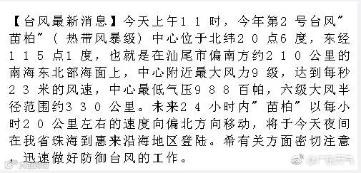 专家指出,“苗柏”将成为今年登陆广东的第一个台风,其后期路径和强度存在很大的不确定性,防御准备时间紧。