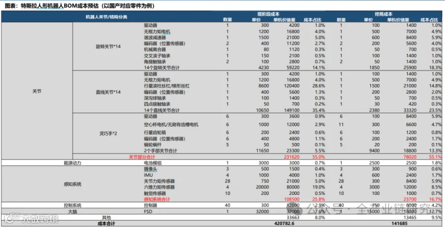 人形机器人各环节成本拆分