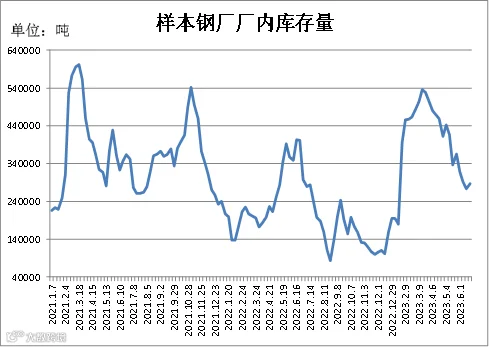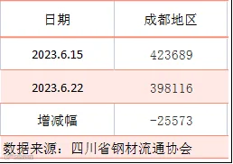 据四川省钢材流通协会统计,截止6月22日成都地区样本库房中螺纹钢及线材库存总量为398116吨,较上周减少25573吨,较去年同期减少121060吨。本期社会库存继续下滑,由于钢厂出货量减少,贸易商仍以降库为主。