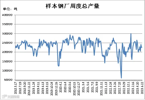 (6月16日-6月22日)四川省钢材流通协会对四家样本钢厂关于建材产量统计数据显示,本周A、B较上周分别减少2000吨、1927.23吨;C、D较上周分别增加4000吨、1600吨。四家样本钢厂总产量为226389吨,周环比增加1673吨。