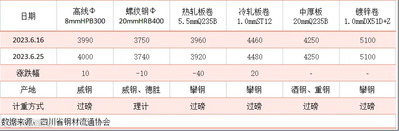 据四川省钢材流通协会对成都现货市场监测显示,本期建筑钢材价格先扬后抑,由于炉料走弱压低炼钢成本,期螺下跌打压市场信心。6月25日,成都地区Φ20mm HRB400螺纹钢价格为3740元/吨,较6月16日跌10元/吨;Φ8mm HPB300高线价格为4000元/吨,较上一周涨10元/吨。