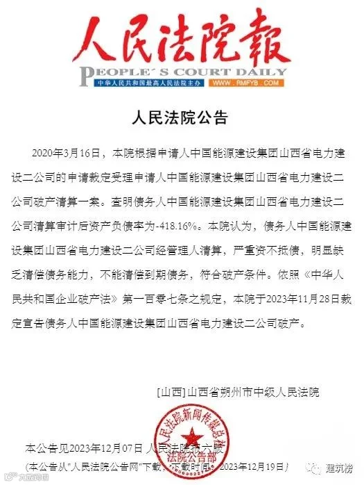 中国能源建设集团山西省电力建设二公司严重资不抵债,于2023年11月28日裁定宣告破产。