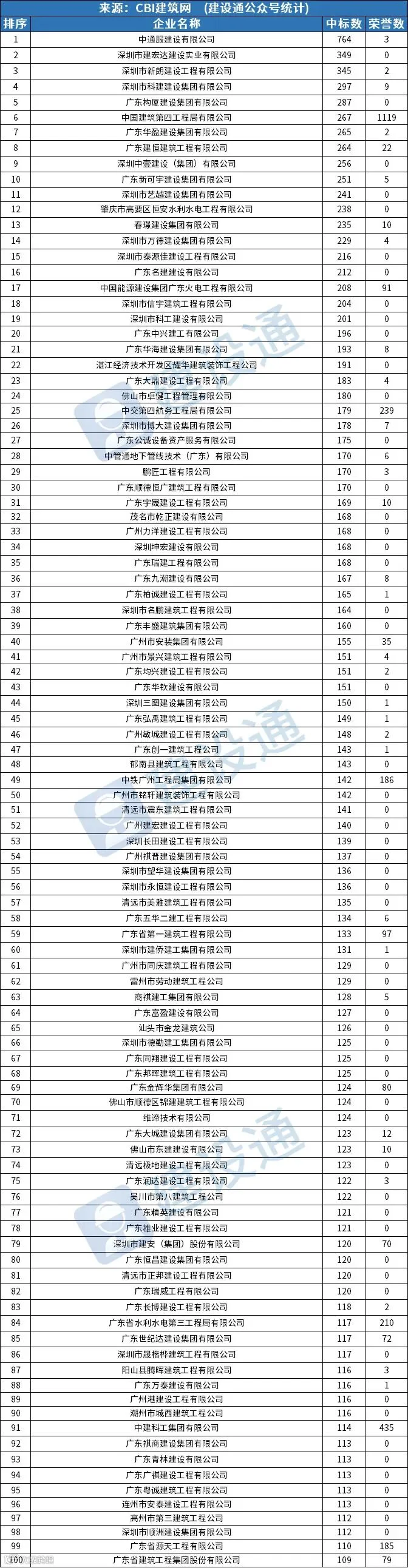 CBI建筑网综合报道在2024年,广东省建筑施工企业中标数量达150210,同比(与去年同期)下降30.12%。其中,中通服建设有限公司、深圳市建宏达建设实业有限公司、深圳市新朗建设工程有限公司分列广东省建筑施工企业中标数量排行榜前三位。