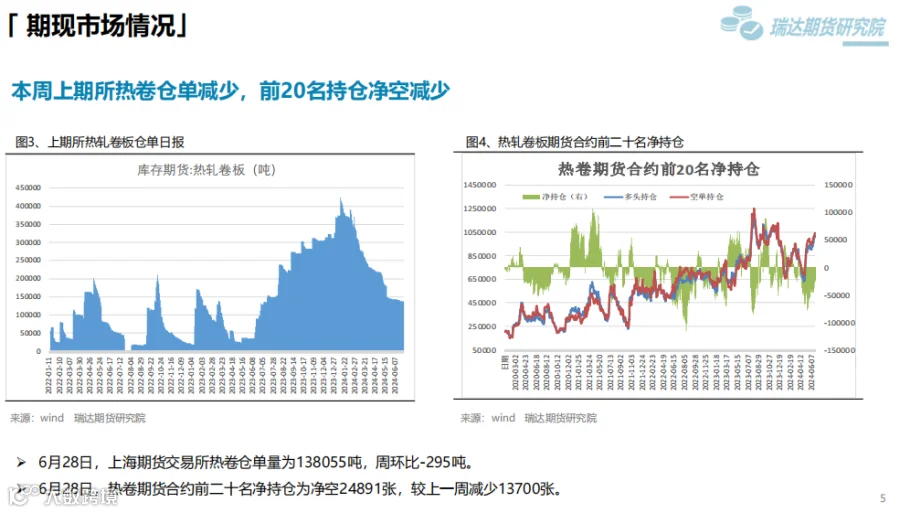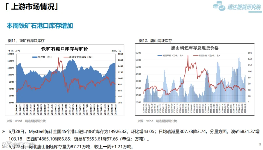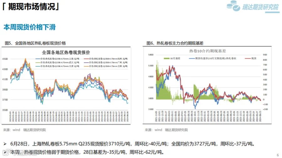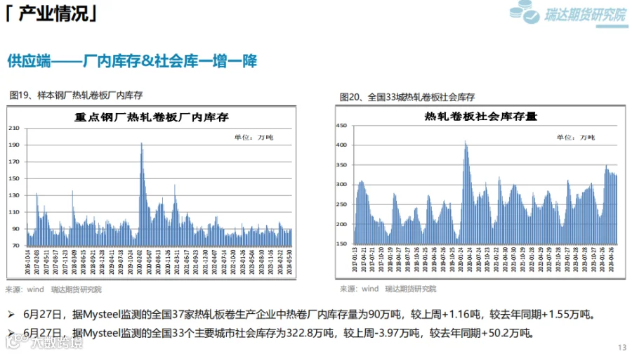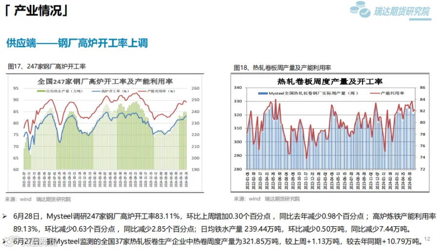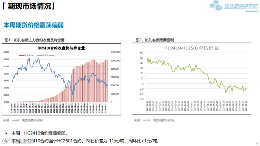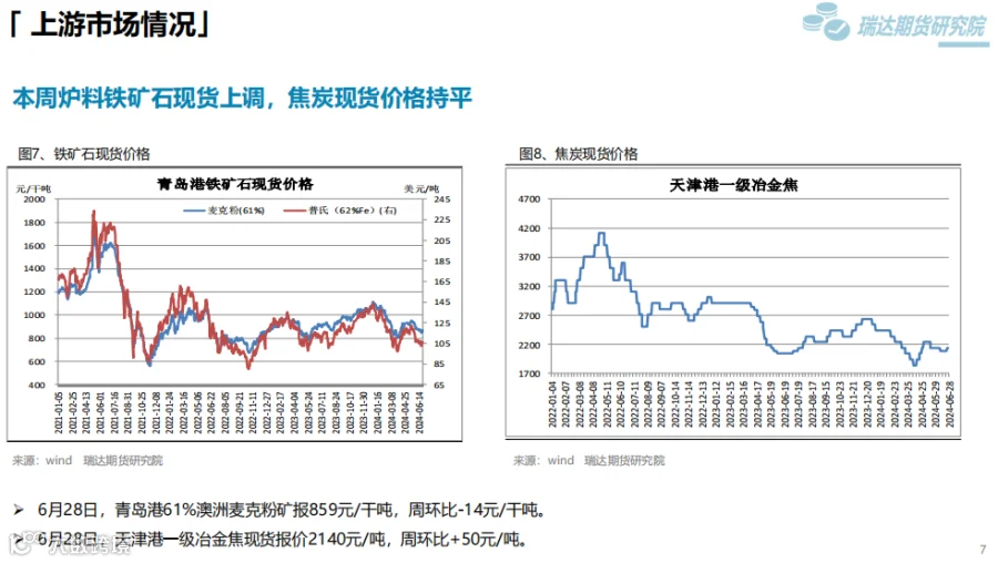 本周(6.21-6.28)热卷价格弱势整理。周内,河北、山东等地主流钢厂发函接受焦炭提涨,涨幅为50-55元/吨,焦炭首轮提涨落地,成本端一度支撑热卷价格反弹。但目前热卷现货供应仍处于高位,市场库存变化不大,叠加传统淡季影响,市场交投氛围偏弱,基本保持低库存为主,价格反弹承压。下周(6.28-7.5)供应端、热卷周度产量小幅上调,产能利用率维持在80%上方,现货供应维持宽松。需求端,传统消费淡季,终端刚需为主,库存量延续小幅下滑,周度表观需求维持320万吨附近。最后,短期宏观面向好,叠加高炉开工率上调,成本端对钢价构成支撑,但终端需量增量有限或抑制反弹空间。