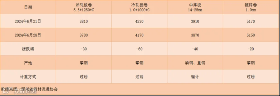 据四川省钢材流通协会对本周成都现货市场监测显示:热轧板卷较上周价格下跌30元/吨;冷轧板卷较上周价格下跌60元/吨;中厚板较上周价格下跌40元/吨;镀锌卷较上周价格下跌20元/吨。