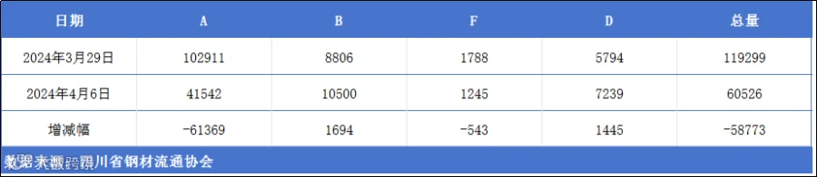 以上表单中的数据完全由川钢协信息统计部人员客观采集自相关钢厂、库房和贸易企业,川钢协力求数据及内容的准确、客观,但不能保证其完整性或准确性;本数据简报仅供浏览者参考,并不构成建议,川钢协不对该数据、简报及使用该数据和简报所导致的结果承担责任。