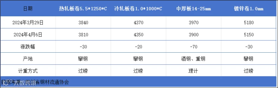 据四川省钢材流通协会对本周成都现货市场监测显示:热轧板卷较上周价格下跌30元/吨;冷轧板卷较上周价格下跌20元/吨;中厚板较上周价格下跌70元/吨;镀锌卷较上周价格下跌30元/吨。