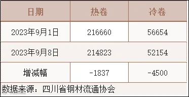 据四川省钢材流通协会统计,本周成都地区样本库房中热卷库存量为214823吨,较上周减少1837吨。冷卷库存量为52154吨,较上周减少4500吨。